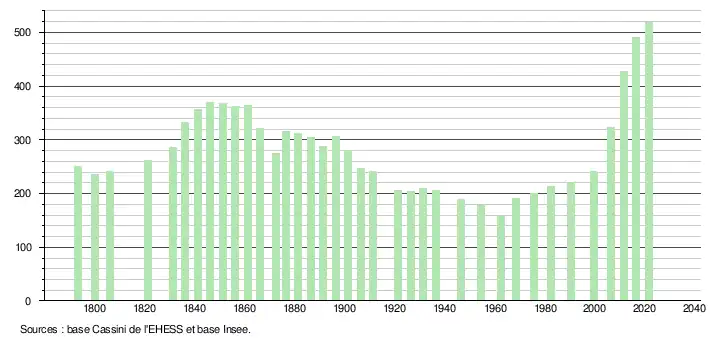 L'évolution du nombre d'habitants est connue à travers les recensements de la population effectués dans la commune depuis 1793. Pour les communes de moins de 10 000 habitants, une enquête de recensement portant sur toute la population est réalisée tous les cinq ans, les populations légales des années intermédiaires étant quant à elles estimées par interpolation ou extrapolation[37]. Pour la commune, le premier recensement exhaustif entrant dans le cadre du nouveau dispositif a été réalisé en 2006[38].