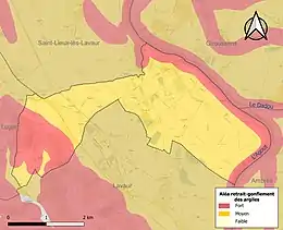 La commune est vulnérable au risque de mouvements de terrains constitué principalement du retrait-gonflement des sols argileux[28]. Cet aléa est susceptible d'engendrer des dommages importants aux bâtiments en cas d’alternance de périodes de sécheresse et de pluie. La totalité de la commune est en aléa moyen ou fort (76,3 % au niveau départemental et 48,5 % au niveau national). Sur les 181 bâtiments dénombrés sur la commune en 2019, 181 sont en aléa moyen ou fort, soit 100 %, à comparer aux 90 % au niveau départemental et 54 % au niveau national. Une cartographie de l'exposition du territoire national au retrait gonflement des sols argileux est disponible sur le site du BRGM[29],[Carte 3].