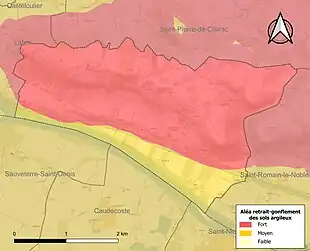 Le retrait-gonflement des sols argileux est susceptible d'engendrer des dommages importants aux bâtiments en cas d’alternance de périodes de sécheresse et de pluie[25]. La totalité de la commune est en aléa moyen ou fort (91,8 % au niveau départemental et 48,5 % au niveau national)[Carte 2]. Depuis le , en application de la loi ELAN, différentes contraintes s'imposent aux vendeurs, maîtres d'ouvrages ou constructeurs de biens situés dans une zone classée en aléa moyen ou fort[Note 4],[26].
