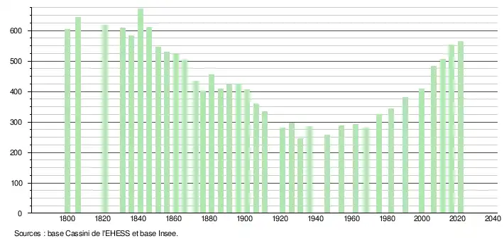 L'évolution du nombre d'habitants est connue à travers les recensements de la population effectués dans la commune depuis 1800. Pour les communes de moins de 10 000 habitants, une enquête de recensement portant sur toute la population est réalisée tous les cinq ans, les populations légales des années intermédiaires étant quant à elles estimées par interpolation ou extrapolation[29]. Pour la commune, le premier recensement exhaustif entrant dans le cadre du nouveau dispositif a été réalisé en 2006[30].
