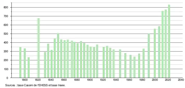 L'évolution du nombre d'habitants est connue à travers les recensements de la population effectués dans la commune depuis 1793. Pour les communes de moins de 10 000 habitants, une enquête de recensement portant sur toute la population est réalisée tous les cinq ans, les populations légales des années intermédiaires étant quant à elles estimées par interpolation ou extrapolation[17]. Pour la commune, le premier recensement exhaustif entrant dans le cadre du nouveau dispositif a été réalisé en 2006[18].