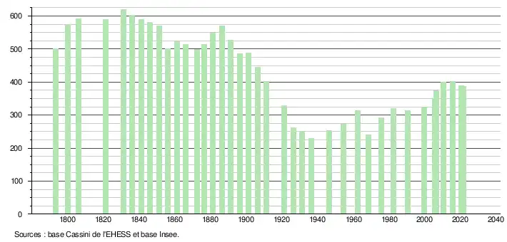 L'évolution du nombre d'habitants est connue à travers les recensements de la population effectués dans la commune depuis 1793. Pour les communes de moins de 10 000 habitants, une enquête de recensement portant sur toute la population est réalisée tous les cinq ans, les populations légales des années intermédiaires étant quant à elles estimées par interpolation ou extrapolation[14]. Pour la commune, le premier recensement exhaustif entrant dans le cadre du nouveau dispositif a été réalisé en 2005[15].