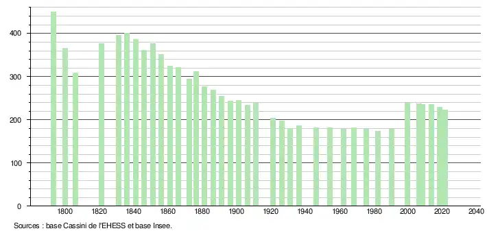 L'évolution du nombre d'habitants est connue à travers les recensements de la population effectués dans la commune depuis 1793. Pour les communes de moins de 10 000 habitants, une enquête de recensement portant sur toute la population est réalisée tous les cinq ans, les populations légales des années intermédiaires étant quant à elles estimées par interpolation ou extrapolation[20]. Pour la commune, le premier recensement exhaustif entrant dans le cadre du nouveau dispositif a été réalisé en 2008[21].