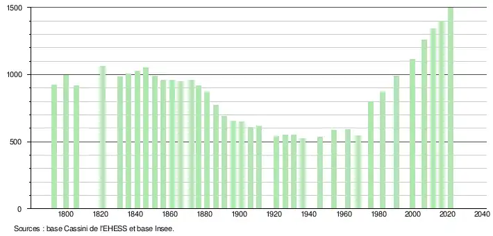 L'évolution du nombre d'habitants est connue à travers les recensements de la population effectués dans la commune depuis 1793. Pour les communes de moins de 10 000 habitants, une enquête de recensement portant sur toute la population est réalisée tous les cinq ans, les populations légales des années intermédiaires étant quant à elles estimées par interpolation ou extrapolation[25]. Pour la commune, le premier recensement exhaustif entrant dans le cadre du nouveau dispositif a été réalisé en 2006[26].