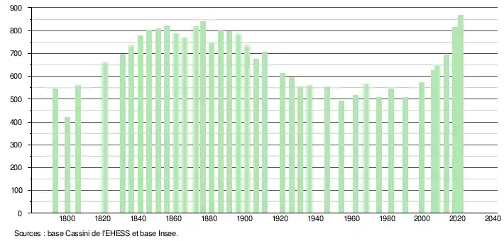 L'évolution du nombre d'habitants est connue à travers les recensements de la population effectués dans la commune depuis 1793. Pour les communes de moins de 10 000 habitants, une enquête de recensement portant sur toute la population est réalisée tous les cinq ans, les populations légales des années intermédiaires étant quant à elles estimées par interpolation ou extrapolation[18]. Pour la commune, le premier recensement exhaustif entrant dans le cadre du nouveau dispositif a été réalisé en 2008[19].