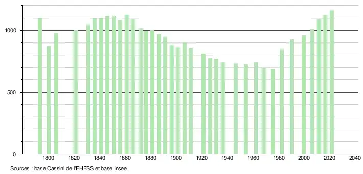 L'évolution du nombre d'habitants est connue à travers les recensements de la population effectués dans la commune depuis 1793. Pour les communes de moins de 10 000 habitants, une enquête de recensement portant sur toute la population est réalisée tous les cinq ans, les populations légales des années intermédiaires étant quant à elles estimées par interpolation ou extrapolation[34]. Pour la commune, le premier recensement exhaustif entrant dans le cadre du nouveau dispositif a été réalisé en 2006[35].