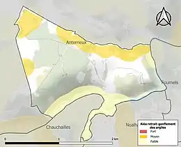 Le retrait-gonflement des sols argileux est susceptible d'engendrer des dommages importants aux bâtiments en cas d’alternance de périodes de sécheresse et de pluie. 16,8 % de la superficie communale est en aléa moyen ou fort (15,8 % au niveau départemental et 48,5 % au niveau national). Sur les 71 bâtiments dénombrés sur la commune en 2019, aucun n'est en aléa moyen ou fort, à comparer aux 14 % au niveau départemental et 54 % au niveau national. Une cartographie de l'exposition du territoire national au retrait gonflement des sols argileux est disponible sur le site du BRGM[21],[Carte 2].