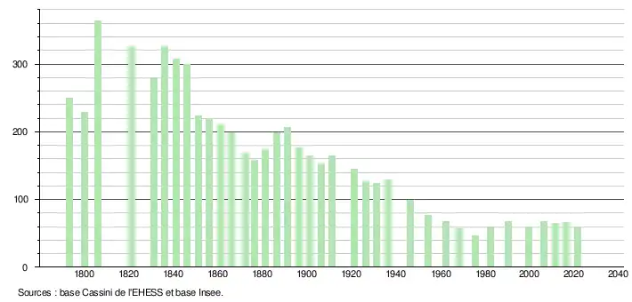 L'évolution du nombre d'habitants est connue à travers les recensements de la population effectués dans la commune depuis 1793. Pour les communes de moins de 10 000 habitants, une enquête de recensement portant sur toute la population est réalisée tous les cinq ans, les populations légales des années intermédiaires étant quant à elles estimées par interpolation ou extrapolation[30]. Pour la commune, le premier recensement exhaustif entrant dans le cadre du nouveau dispositif a été réalisé en 2006[31].