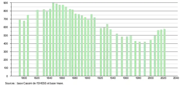 L'évolution du nombre d'habitants est connue à travers les recensements de la population effectués dans la commune depuis 1793. Pour les communes de moins de 10 000 habitants, une enquête de recensement portant sur toute la population est réalisée tous les cinq ans, les populations légales des années intermédiaires étant quant à elles estimées par interpolation ou extrapolation[18]. Pour la commune, le premier recensement exhaustif entrant dans le cadre du nouveau dispositif a été réalisé en 2006[19].