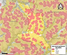 La commune est vulnérable au risque de mouvements de terrains constitué principalement du retrait-gonflement des sols argileux[27]. Cet aléa est susceptible d'engendrer des dommages importants aux bâtiments en cas d’alternance de périodes de sécheresse et de pluie. 91,5 % de la superficie communale est en aléa moyen ou fort (76,3 % au niveau départemental et 48,5 % au niveau national). Sur les 120 bâtiments dénombrés sur la commune en 2019, 119 sont en aléa moyen ou fort, soit 99 %, à comparer aux 90 % au niveau départemental et 54 % au niveau national. Une cartographie de l'exposition du territoire national au retrait gonflement des sols argileux est disponible sur le site du BRGM[28],[Carte 3].