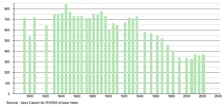 L'évolution du nombre d'habitants est connue à travers les recensements de la population effectués dans la commune depuis 1793. Pour les communes de moins de 10 000 habitants, une enquête de recensement portant sur toute la population est réalisée tous les cinq ans, les populations légales des années intermédiaires étant quant à elles estimées par interpolation ou extrapolation[27]. Pour la commune, le premier recensement exhaustif entrant dans le cadre du nouveau dispositif a été réalisé en 2005[28].
