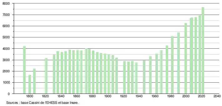 L'évolution du nombre d'habitants est connue à travers les recensements de la population effectués dans la commune depuis 1793. Pour les communes de moins de 10 000 habitants, une enquête de recensement portant sur toute la population est réalisée tous les cinq ans, les populations légales des années intermédiaires étant quant à elles estimées par interpolation ou extrapolation[26]. Pour la commune, le premier recensement exhaustif entrant dans le cadre du nouveau dispositif a été réalisé en 2007[27].