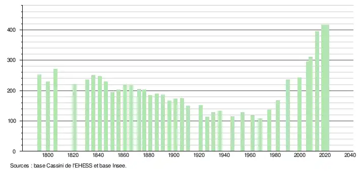 L'évolution du nombre d'habitants est connue à travers les recensements de la population effectués dans la commune depuis 1793. Pour les communes de moins de 10 000 habitants, une enquête de recensement portant sur toute la population est réalisée tous les cinq ans, les populations légales des années intermédiaires étant quant à elles estimées par interpolation ou extrapolation[22]. Pour la commune, le premier recensement exhaustif entrant dans le cadre du nouveau dispositif a été réalisé en 2008[23].
