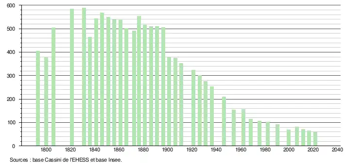L'évolution du nombre d'habitants est connue à travers les recensements de la population effectués dans la commune depuis 1793. Pour les communes de moins de 10 000 habitants, une enquête de recensement portant sur toute la population est réalisée tous les cinq ans, les populations légales des années intermédiaires étant quant à elles estimées par interpolation ou extrapolation[18]. Pour la commune, le premier recensement exhaustif entrant dans le cadre du nouveau dispositif a été réalisé en 2006[19].