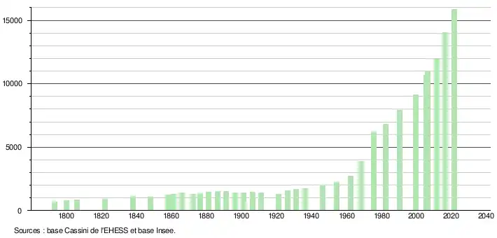 - Par convention dans Wikipédia, le principe a été retenu de n’afficher dans le tableau des recensements et le graphique, pour les populations légales postérieures à 1999, que les populations correspondant à une enquête exhaustive de recensement pour les communes de moins de 10 000 habitants, et que les populations des années 2006, 2011, 2016, etc. pour les communes de plus de 10 000 habitants, ainsi que la dernière population légale publiée par l’Insee pour l'ensemble des communes.