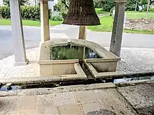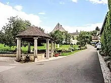 Blason | Écartelé : au 1er d'or à trois demi-ramures de sable posées en fasce et rangées en pal, au 2e de gueules à deux bars adossés d'or, au 3e de gueules au temple du lieu d'or ouvert et ajouré de sable, au 4e d'or à la fontaine-lavoir du lieu de sable[22]. |