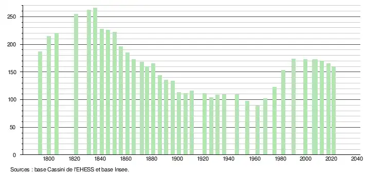 L'évolution du nombre d'habitants est connue à travers les recensements de la population effectués dans la commune depuis 1793. Pour les communes de moins de 10 000 habitants, une enquête de recensement portant sur toute la population est réalisée tous les cinq ans, les populations légales des années intermédiaires étant quant à elles estimées par interpolation ou extrapolation[17]. Pour la commune, le premier recensement exhaustif entrant dans le cadre du nouveau dispositif a été réalisé en 2007[18].