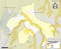 Le retrait-gonflement des sols argileux est susceptible d'engendrer des dommages importants aux bâtiments en cas d’alternance de périodes de sécheresse et de pluie. 20,6 % de la superficie communale est en aléa moyen ou fort (33,6 % au niveau départemental et 48,5 % au niveau national). Sur les 146 bâtiments dénombrés sur la commune en 2019, 1 sont en aléa moyen ou fort, soit 1 %, à comparer aux 25 % au niveau départemental et 54 % au niveau national. Une cartographie de l'exposition du territoire national au retrait gonflement des sols argileux est disponible sur le site du BRGM[25],[Carte 2].