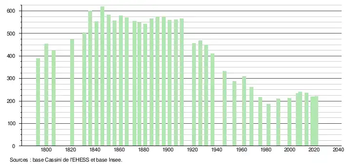 L'évolution du nombre d'habitants est connue à travers les recensements de la population effectués dans la commune depuis 1793. Pour les communes de moins de 10 000 habitants, une enquête de recensement portant sur toute la population est réalisée tous les cinq ans, les populations légales des années intermédiaires étant quant à elles estimées par interpolation ou extrapolation[29]. Pour la commune, le premier recensement exhaustif entrant dans le cadre du nouveau dispositif a été réalisé en 2008[30].