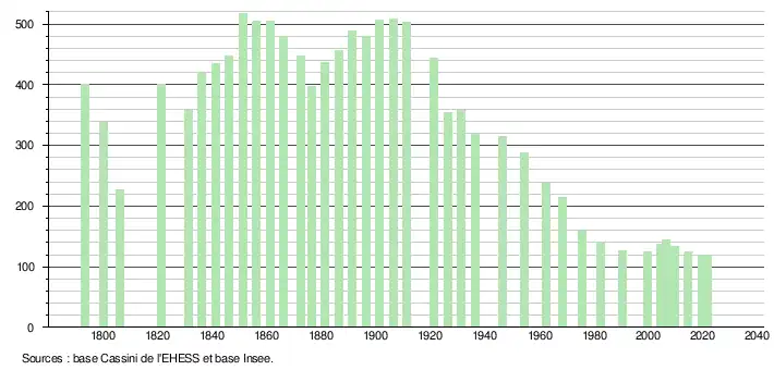 L'évolution du nombre d'habitants est connue à travers les recensements de la population effectués dans la commune depuis 1793. Pour les communes de moins de 10 000 habitants, une enquête de recensement portant sur toute la population est réalisée tous les cinq ans, les populations légales des années intermédiaires étant quant à elles estimées par interpolation ou extrapolation[24]. Pour la commune, le premier recensement exhaustif entrant dans le cadre du nouveau dispositif a été réalisé en 2004[25].