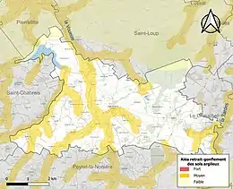 Le retrait-gonflement des sols argileux est susceptible d'engendrer des dommages importants aux bâtiments en cas d’alternance de périodes de sécheresse et de pluie. 27,9 % de la superficie communale est en aléa moyen ou fort (33,6 % au niveau départemental et 48,5 % au niveau national). Sur les 115 bâtiments dénombrés sur la commune en 2019, 51 sont en aléa moyen ou fort, soit 44 %, à comparer aux 25 % au niveau départemental et 54 % au niveau national. Une cartographie de l'exposition du territoire national au retrait gonflement des sols argileux est disponible sur le site du BRGM[28],[Carte 2].