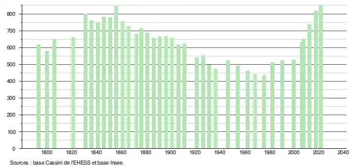 L'évolution du nombre d'habitants est connue à travers les recensements de la population effectués dans la commune depuis 1793. Pour les communes de moins de 10 000 habitants, une enquête de recensement portant sur toute la population est réalisée tous les cinq ans, les populations légales des années intermédiaires étant quant à elles estimées par interpolation ou extrapolation[17]. Pour la commune, le premier recensement exhaustif entrant dans le cadre du nouveau dispositif a été réalisé en 2007[18].