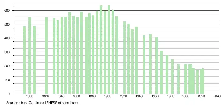 L'évolution du nombre d'habitants est connue à travers les recensements de la population effectués dans la commune depuis 1793. Pour les communes de moins de 10 000 habitants, une enquête de recensement portant sur toute la population est réalisée tous les cinq ans, les populations légales des années intermédiaires étant quant à elles estimées par interpolation ou extrapolation[21]. Pour la commune, le premier recensement exhaustif entrant dans le cadre du nouveau dispositif a été réalisé en 2004[22].
