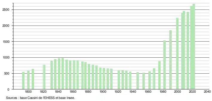 L'évolution du nombre d'habitants est connue à travers les recensements de la population effectués dans la commune depuis 1793. Pour les communes de moins de 10 000 habitants, une enquête de recensement portant sur toute la population est réalisée tous les cinq ans, les populations légales des années intermédiaires étant quant à elles estimées par interpolation ou extrapolation[21]. Pour la commune, le premier recensement exhaustif entrant dans le cadre du nouveau dispositif a été réalisé en 2008[22].