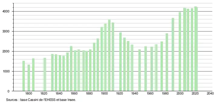 L'évolution du nombre d'habitants est connue à travers les recensements de la population effectués dans la commune depuis 1793. Pour les communes de moins de 10 000 habitants, une enquête de recensement portant sur toute la population est réalisée tous les cinq ans, les populations légales des années intermédiaires étant quant à elles estimées par interpolation ou extrapolation[19]. Pour la commune, le premier recensement exhaustif entrant dans le cadre du nouveau dispositif a été réalisé en 2005[20].