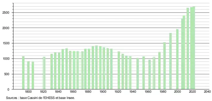 L'évolution du nombre d'habitants est connue à travers les recensements de la population effectués dans la commune depuis 1793. Pour les communes de moins de 10 000 habitants, une enquête de recensement portant sur toute la population est réalisée tous les cinq ans, les populations légales des années intermédiaires étant quant à elles estimées par interpolation ou extrapolation[24]. Pour la commune, le premier recensement exhaustif entrant dans le cadre du nouveau dispositif a été réalisé en 2008[25].