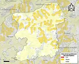 Le retrait-gonflement des sols argileux est susceptible d'engendrer des dommages importants aux bâtiments en cas d’alternance de périodes de sécheresse et de pluie[17]. 25,4 % de la superficie communale est en aléa moyen ou fort (27 % au niveau départemental et 48,5 % au niveau national métropolitain)[Carte 2]. Depuis le , en application de la loi ÉLAN, différentes contraintes s'imposent aux vendeurs, maîtres d'ouvrages ou constructeurs de biens situés dans une zone classée en aléa moyen ou fort[Note 4],[18].