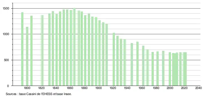 L'évolution du nombre d'habitants est connue à travers les recensements de la population effectués dans la commune depuis 1793. Pour les communes de moins de 10 000 habitants, une enquête de recensement portant sur toute la population est réalisée tous les cinq ans, les populations légales des années intermédiaires étant quant à elles estimées par interpolation ou extrapolation[20]. Pour la commune, le premier recensement exhaustif entrant dans le cadre du nouveau dispositif a été réalisé en 2004[21].