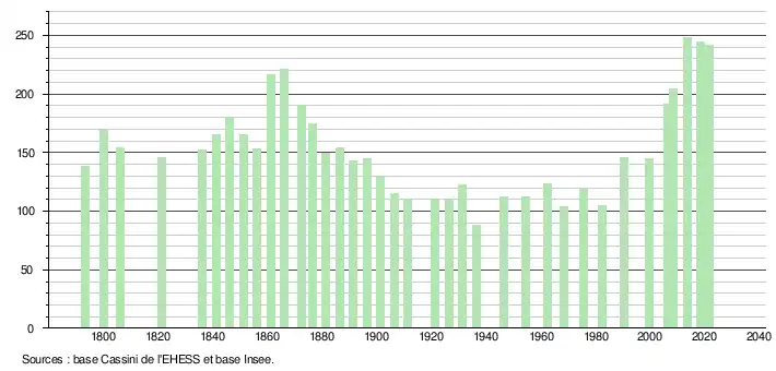 L'évolution du nombre d'habitants est connue à travers les recensements de la population effectués dans la commune depuis 1793. Pour les communes de moins de 10 000 habitants, une enquête de recensement portant sur toute la population est réalisée tous les cinq ans, les populations légales des années intermédiaires étant quant à elles estimées par interpolation ou extrapolation[19]. Pour la commune, le premier recensement exhaustif entrant dans le cadre du nouveau dispositif a été réalisé en 2008[20].