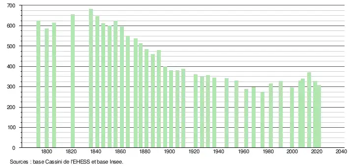 L'évolution du nombre d'habitants est connue à travers les recensements de la population effectués dans la commune depuis 1793. Pour les communes de moins de 10 000 habitants, une enquête de recensement portant sur toute la population est réalisée tous les cinq ans, les populations légales des années intermédiaires étant quant à elles estimées par interpolation ou extrapolation[25]. Pour la commune, le premier recensement exhaustif entrant dans le cadre du nouveau dispositif a été réalisé en 2008[26].