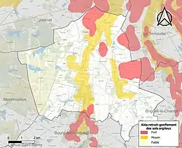 Les mouvements de terrains susceptibles de se produire sur la commune sont des affaissements et effondrements liés aux cavités souterraines (hors mines) et des tassements différentiels[25]. Afin de mieux appréhender le risque d’affaissement de terrain, un inventaire national permet de localiser les éventuelles cavités souterraines sur la commune[26]. Le retrait-gonflement des sols argileux est susceptible d'engendrer des dommages importants aux bâtiments en cas d’alternance de périodes de sécheresse et de pluie[27]. 26,2 % de la superficie communale est en aléa moyen ou fort (79,5 % au niveau départemental et 48,5 % au niveau national)[Carte 2]. Depuis le , en application de la loi ÉLAN, différentes contraintes s'imposent aux vendeurs, maîtres d'ouvrages ou constructeurs de biens situés dans une zone classée en aléa moyen ou fort[Note 4],[28].