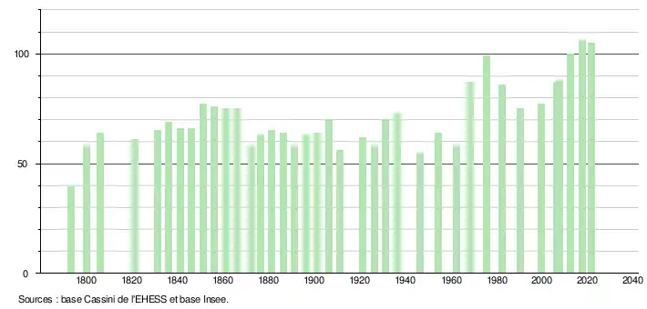 L'évolution du nombre d'habitants est connue à travers les recensements de la population effectués dans la commune depuis 1793. Pour les communes de moins de 10 000 habitants, une enquête de recensement portant sur toute la population est réalisée tous les cinq ans, les populations légales des années intermédiaires étant quant à elles estimées par interpolation ou extrapolation[25]. Pour la commune, le premier recensement exhaustif entrant dans le cadre du nouveau dispositif a été réalisé en 2007[26].