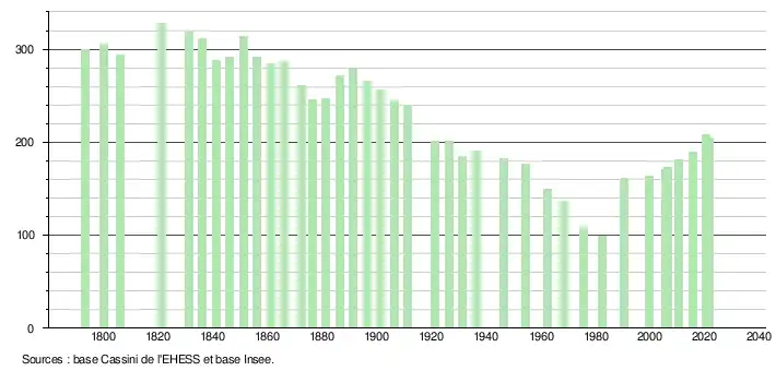 L'évolution du nombre d'habitants est connue à travers les recensements de la population effectués dans la commune depuis 1793. Pour les communes de moins de 10 000 habitants, une enquête de recensement portant sur toute la population est réalisée tous les cinq ans, les populations légales des années intermédiaires étant quant à elles estimées par interpolation ou extrapolation[18]. Pour la commune, le premier recensement exhaustif entrant dans le cadre du nouveau dispositif a été réalisé en 2005[19].