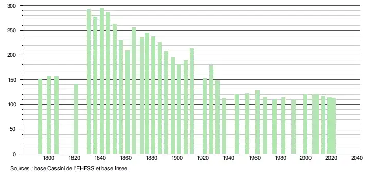 L'évolution du nombre d'habitants est connue à travers les recensements de la population effectués dans la commune depuis 1793. Pour les communes de moins de 10 000 habitants, une enquête de recensement portant sur toute la population est réalisée tous les cinq ans, les populations légales des années intermédiaires étant quant à elles estimées par interpolation ou extrapolation[17]. Pour la commune, le premier recensement exhaustif entrant dans le cadre du nouveau dispositif a été réalisé en 2008[18].