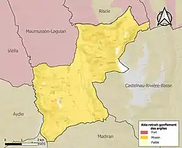 Le retrait-gonflement des sols argileux est susceptible d'engendrer des dommages importants aux bâtiments en cas d’alternance de périodes de sécheresse et de pluie. 98 % de la superficie communale est en aléa moyen ou fort (44,5 % au niveau départemental et 48,5 % au niveau national). Sur les 93 bâtiments dénombrés sur la commune en 2019, 88 sont en aléa moyen ou fort, soit 95 %, à comparer aux 75 % au niveau départemental et 54 % au niveau national. Une cartographie de l'exposition du territoire national au retrait gonflement des sols argileux est disponible sur le site du BRGM[19],[Carte 2].