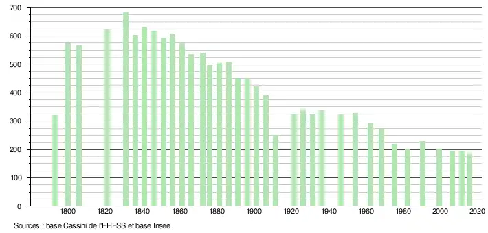 L'évolution du nombre d'habitants est connue à travers les recensements de la population effectués dans la commune depuis 1793. Pour les communes de moins de 10 000 habitants, une enquête de recensement portant sur toute la population est réalisée tous les cinq ans, les populations légales des années intermédiaires étant quant à elles estimées par interpolation ou extrapolation[5]. Pour la commune, le premier recensement exhaustif entrant dans le cadre du nouveau dispositif a été réalisé en 2006[6].