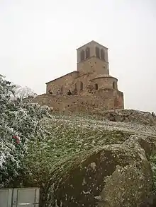 La chapelle elle-même fait l’objet d’une contribution très documentée de l’encyclopédie wikipedia. Il suffira d’illustrer par la photo la sobriété de son architecture préromane, la seule fantaisie est peut-être dans le clocher, refait au XVe siècle. « Il est de plan carré, couvert d’un toit à quatre pans, de faible pente, et éclairé par des baies géminées en plein cintre, garnies d’abat-sons ». A l’intérieur, la nef unique en berceau et l’abside semi-circulaire en cul de four sont typiquement romanes. La couple sur trompes qui supporte le clocher ajoute une note d’élégance[20].