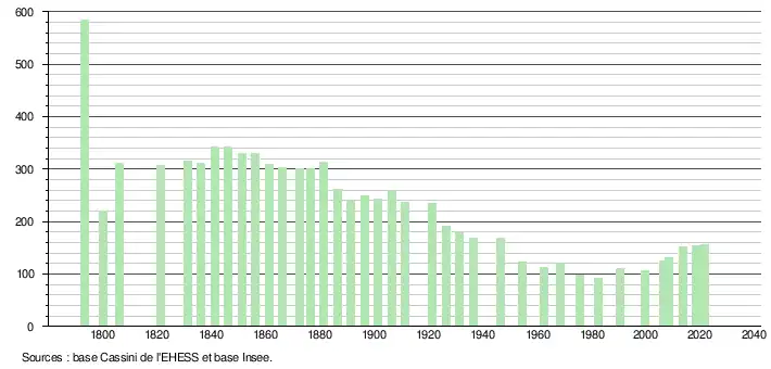 L'évolution du nombre d'habitants est connue à travers les recensements de la population effectués dans la commune depuis 1793. Pour les communes de moins de 10 000 habitants, une enquête de recensement portant sur toute la population est réalisée tous les cinq ans, les populations légales des années intermédiaires étant quant à elles estimées par interpolation ou extrapolation[17]. Pour la commune, le premier recensement exhaustif entrant dans le cadre du nouveau dispositif a été réalisé en 2008[18].