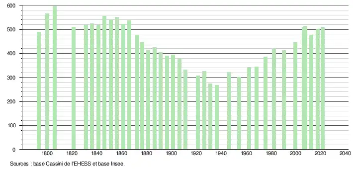 L'évolution du nombre d'habitants est connue à travers les recensements de la population effectués dans la commune depuis 1793. Pour les communes de moins de 10 000 habitants, une enquête de recensement portant sur toute la population est réalisée tous les cinq ans, les populations légales des années intermédiaires étant quant à elles estimées par interpolation ou extrapolation[24]. Pour la commune, le premier recensement exhaustif entrant dans le cadre du nouveau dispositif a été réalisé en 2007[25].