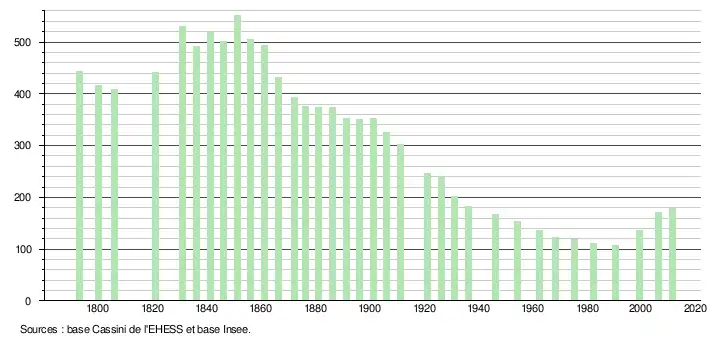 L'évolution du nombre d'habitants est connue à travers les recensements de la population effectués dans la commune depuis 1793. À partir du , les populations légales des communes sont publiées annuellement dans le cadre d'un recensement qui repose désormais sur une collecte d'information annuelle, concernant successivement tous les territoires communaux au cours d'une période de cinq ans. Pour les communes de moins de 10 000 habitants, une enquête de recensement portant sur toute la population est réalisée tous les cinq ans, les populations légales des années intermédiaires étant quant à elles estimées par interpolation ou extrapolation[4]. Pour la commune, le premier recensement exhaustif entrant dans le cadre du nouveau dispositif a été réalisé en 2006[5],[Note 1].