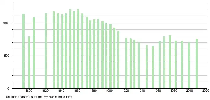 L'évolution du nombre d'habitants est connue à travers les recensements de la population effectués dans la commune depuis 1793. À partir du , les populations légales des communes sont publiées annuellement dans le cadre d'un recensement qui repose désormais sur une collecte d'information annuelle, concernant successivement tous les territoires communaux au cours d'une période de cinq ans. Pour les communes de moins de 10 000 habitants, une enquête de recensement portant sur toute la population est réalisée tous les cinq ans, les populations légales des années intermédiaires étant quant à elles estimées par interpolation ou extrapolation[9]. Pour la commune, le premier recensement exhaustif entrant dans le cadre du nouveau dispositif a été réalisé en 2008[10],[Note 1].