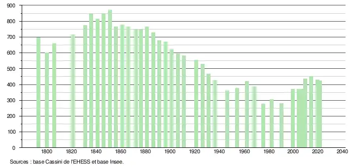L'évolution du nombre d'habitants est connue à travers les recensements de la population effectués dans la commune depuis 1793. Pour les communes de moins de 10 000 habitants, une enquête de recensement portant sur toute la population est réalisée tous les cinq ans, les populations légales des années intermédiaires étant quant à elles estimées par interpolation ou extrapolation[17]. Pour la commune, le premier recensement exhaustif entrant dans le cadre du nouveau dispositif a été réalisé en 2004[18].