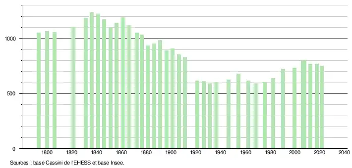 L'évolution du nombre d'habitants est connue à travers les recensements de la population effectués dans la commune depuis 1793. Pour les communes de moins de 10 000 habitants, une enquête de recensement portant sur toute la population est réalisée tous les cinq ans, les populations légales des années intermédiaires étant quant à elles estimées par interpolation ou extrapolation[20]. Pour la commune, le premier recensement exhaustif entrant dans le cadre du nouveau dispositif a été réalisé en 2007[21].