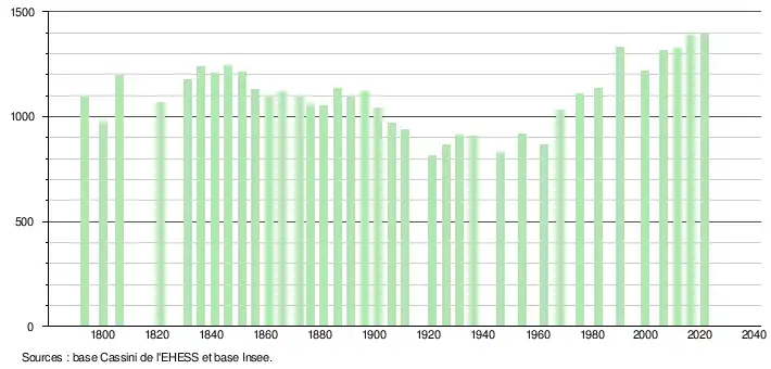 L'évolution du nombre d'habitants est connue à travers les recensements de la population effectués dans la commune depuis 1793. Pour les communes de moins de 10 000 habitants, une enquête de recensement portant sur toute la population est réalisée tous les cinq ans, les populations légales des années intermédiaires étant quant à elles estimées par interpolation ou extrapolation[18]. Pour la commune, le premier recensement exhaustif entrant dans le cadre du nouveau dispositif a été réalisé en 2006[19].
