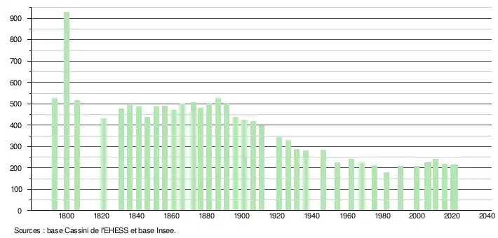 L'évolution du nombre d'habitants est connue à travers les recensements de la population effectués dans la commune depuis 1793. Pour les communes de moins de 10 000 habitants, une enquête de recensement portant sur toute la population est réalisée tous les cinq ans, les populations légales des années intermédiaires étant quant à elles estimées par interpolation ou extrapolation[18]. Pour la commune, le premier recensement exhaustif entrant dans le cadre du nouveau dispositif a été réalisé en 2005[19].
