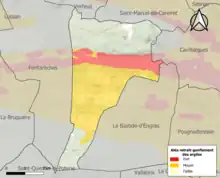 La commune est vulnérable au risque de mouvements de terrains constitué principalement du retrait-gonflement des sols argileux[15]. Cet aléa est susceptible d'engendrer des dommages importants aux bâtiments en cas d’alternance de périodes de sécheresse et de pluie. 54,8 % de la superficie communale est en aléa moyen ou fort (67,5 % au niveau départemental et 48,5 % au niveau national). Sur les 439 bâtiments dénombrés sur la commune en 2019, 439 sont en aléa moyen ou fort, soit 100 %, à comparer aux 90 % au niveau départemental et 54 % au niveau national. Une cartographie de l'exposition du territoire national au retrait gonflement des sols argileux est disponible sur le site du BRGM[16],[Carte 2].